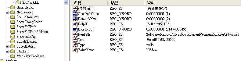 HKEY_LOCAL_MACHINE\Software\Microsoft\windows\CurrentVersion\explorer\Advanced\Folder\Hidden\SHOWALL,把CheckedValue鍵值修改為1